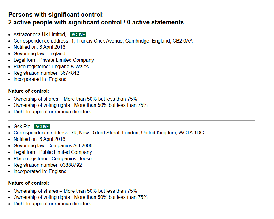 AstraZeneca UK Limited is recorded as a Person with Significant Control (PSC) jointly with GSK PLC, each holding the right to appoint/remove directors and voting control.