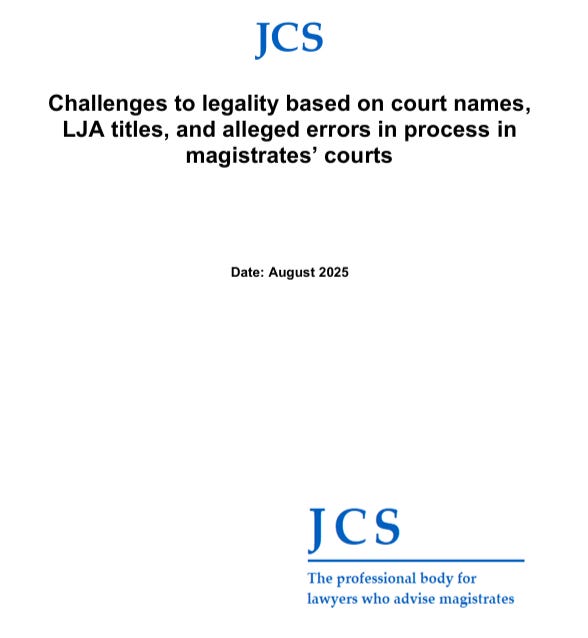 Geddes provides a copy of the JCS guidance “Challenges to legality based on court names, LJA titles, and alleged errors in magistrates’ courts”, August 2025, which is available here: Jurisdiction-LJAs-Courthouses-myths-August-2025-san.pdf